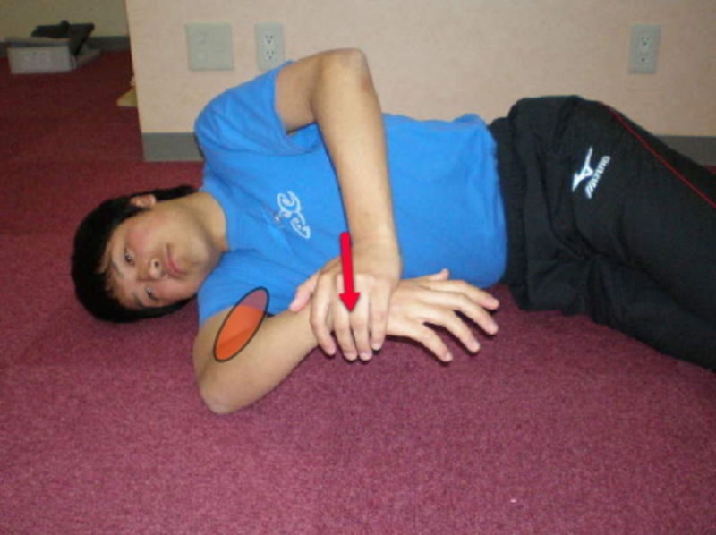 寝た状態で右の肘を曲げて肩の前にだし、左手で右の腕を下に押します。右肩が浮かないように気をつけます。